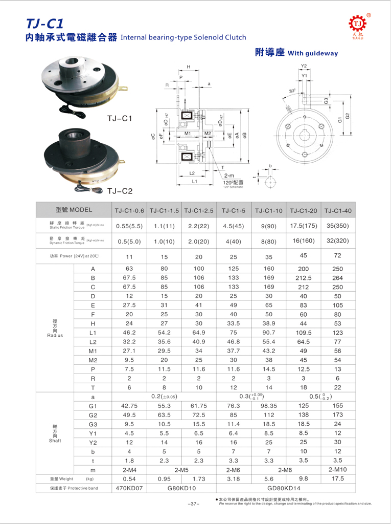 東莞天機(jī)傳動(dòng)(臺(tái)灣天機(jī)牌)電磁離合器生產(chǎn)廠家制造銷售內(nèi)軸承式電磁離合器(掛鉤式電磁離合器),對(duì)應(yīng)的型號(hào)是TJ-C2,電磁離合器線圈通電時(shí),在電磁力的作用下,將主動(dòng)轉(zhuǎn)子與從動(dòng)轉(zhuǎn)子連接在一起,主動(dòng)端與從動(dòng)端同時(shí)轉(zhuǎn)動(dòng),電磁離合器處于閉合的狀態(tài)。